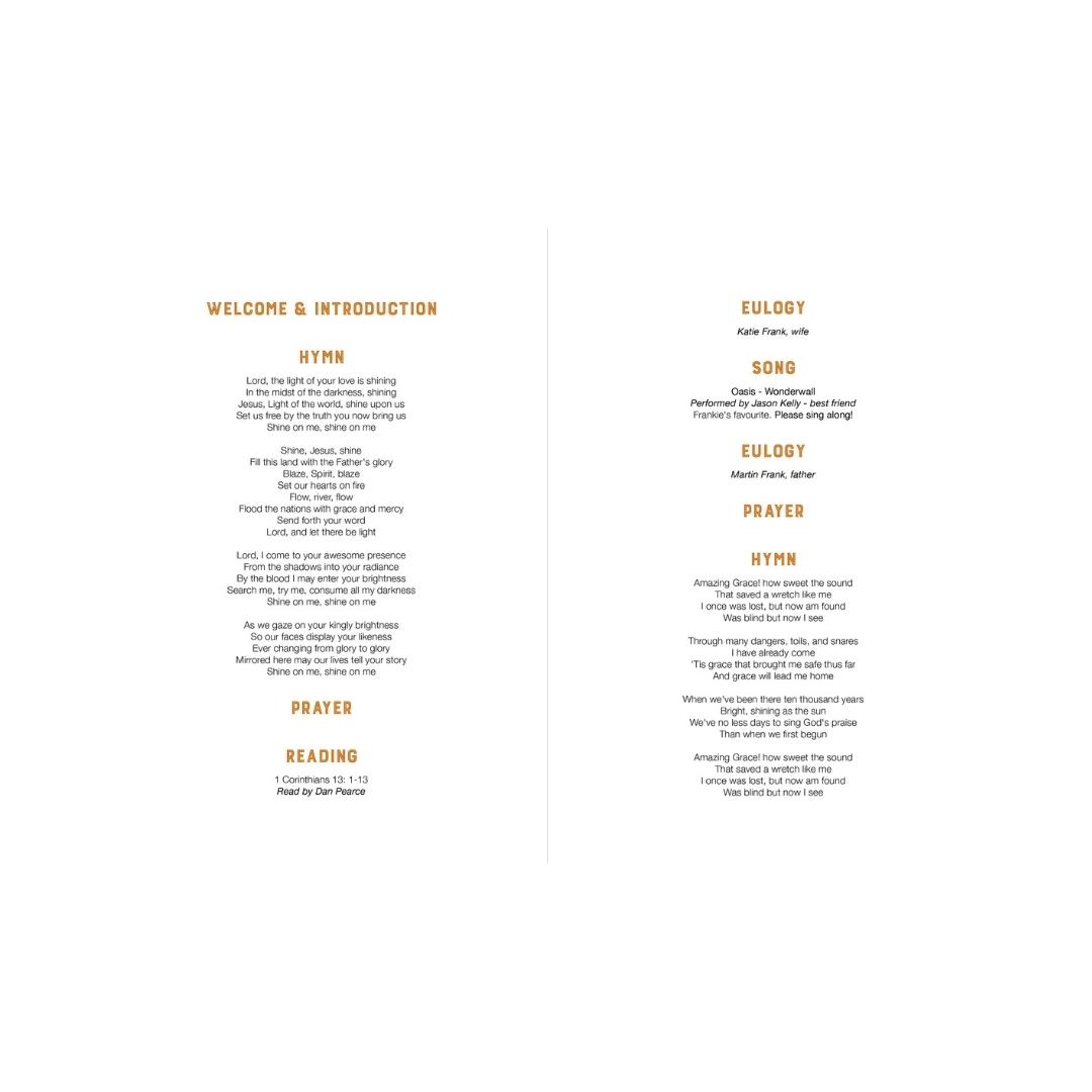A modern and invigorating approach to a funeral order of service, “Greatest Hits” pays tribute to the life of a devoted musician. The substantial uncoated cover and the opulent weight of the text pages bestow upon this funeral stationery the deserving special touch.