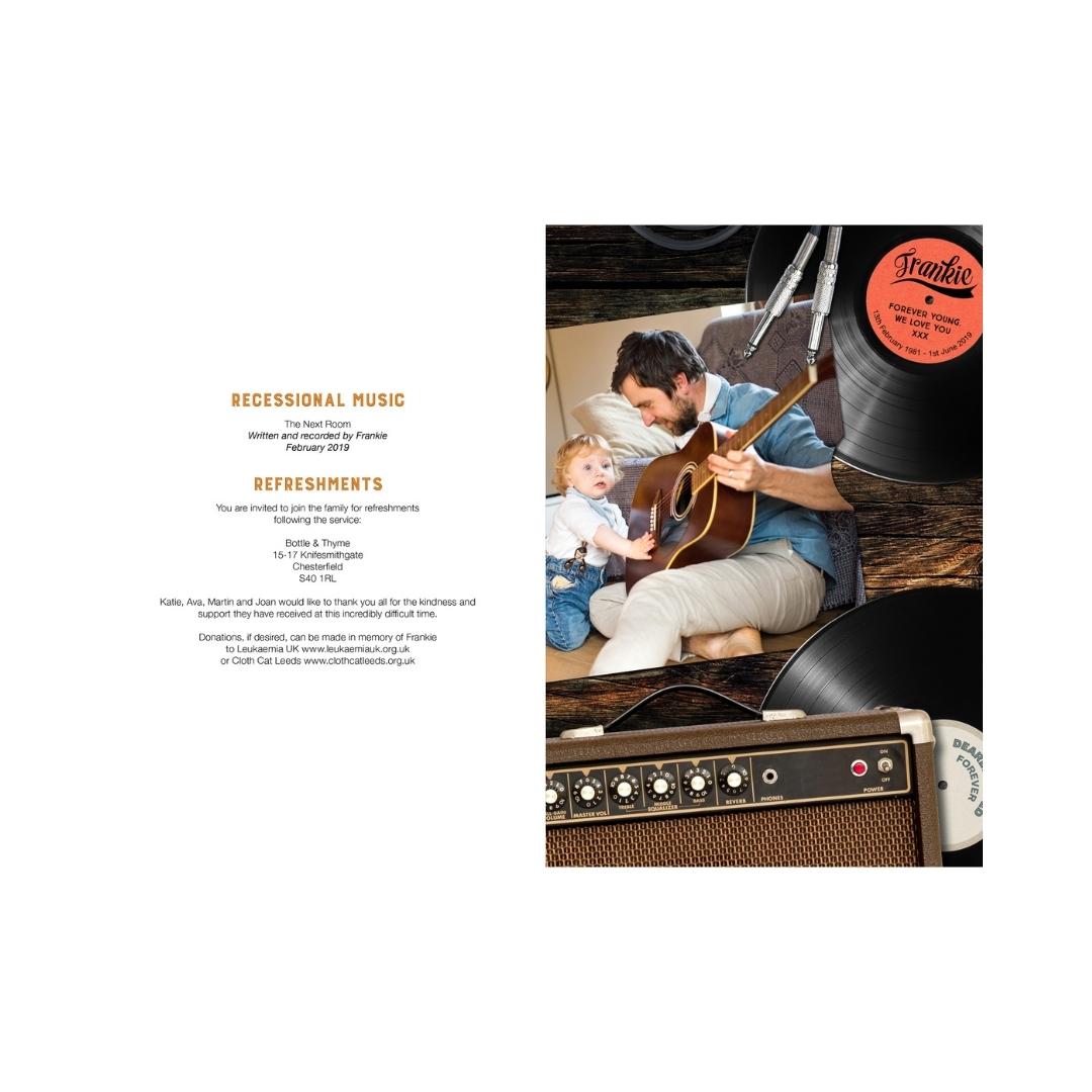 Within this music funeral order of service booklet, you have the option to include readings, hymns, and details about your loved one. Each vinyl record also provides space for a caption or message. We aspire for it to be as unique as the special person you are commemorating—a genuine celebration of life. The included photographs offer family and friends at the memorial service an opportunity to view unseen pictures, rekindling memories and stories to share. We recommend selecting a variety of photos that depict your loved one at different ages, enjoying various aspects of their life, or partaking in experiences with those close to them.
