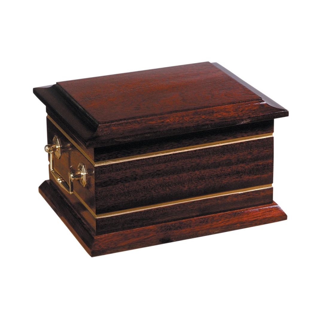 The Lesbury ashes casket from our heartwood range is made from solid Oak, Mahogany or Paulownia, which is a light weight, sustainable and fast growing alternative to Oak. This prestige ashes casket is finished with dark wood stain, gold colour detailing and handles on the sides. The standard size ashes casket can hold the ashes for an adult. Double ashes caskets are available on request.