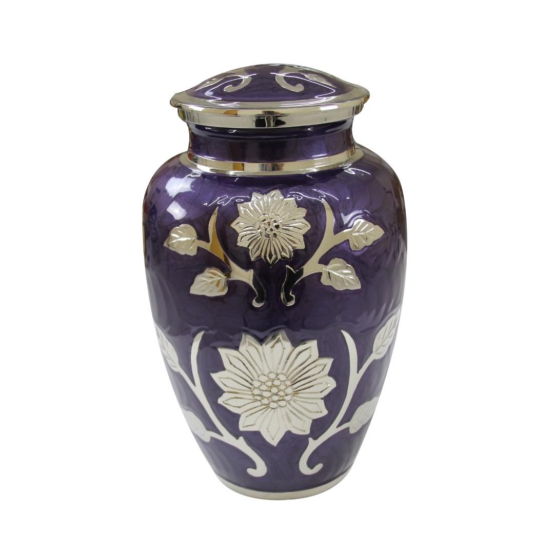 This elegant purple urn with silver floral design is one of our popular choices from the stainless-steel range. The standard size urn is approximately 11″ tall and secured with a lid. This stunning piece of craft is a perfect memento to keep your loved one’s cremation ashes at home.