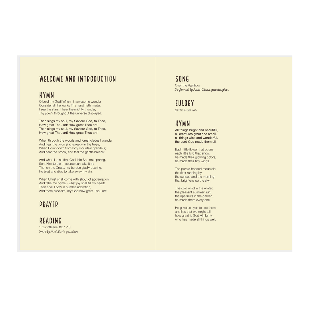Include readings, hymns, and details about your loved one in this gardening-themed funeral order of service. We strive for it to be as unique as the special person you’re commemorating. The photographs offer family and friends a glimpse of unseen moments, rekindling memories and stories to share.