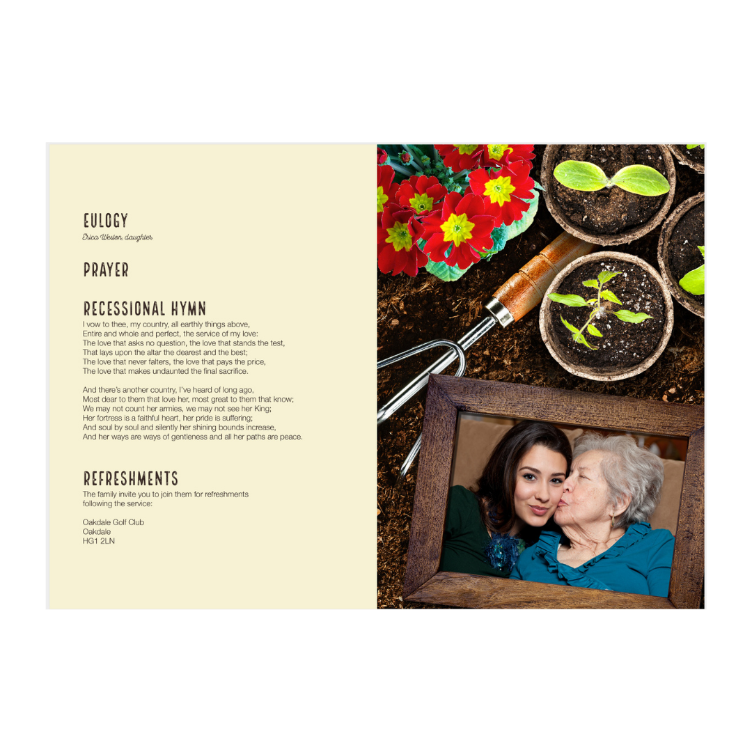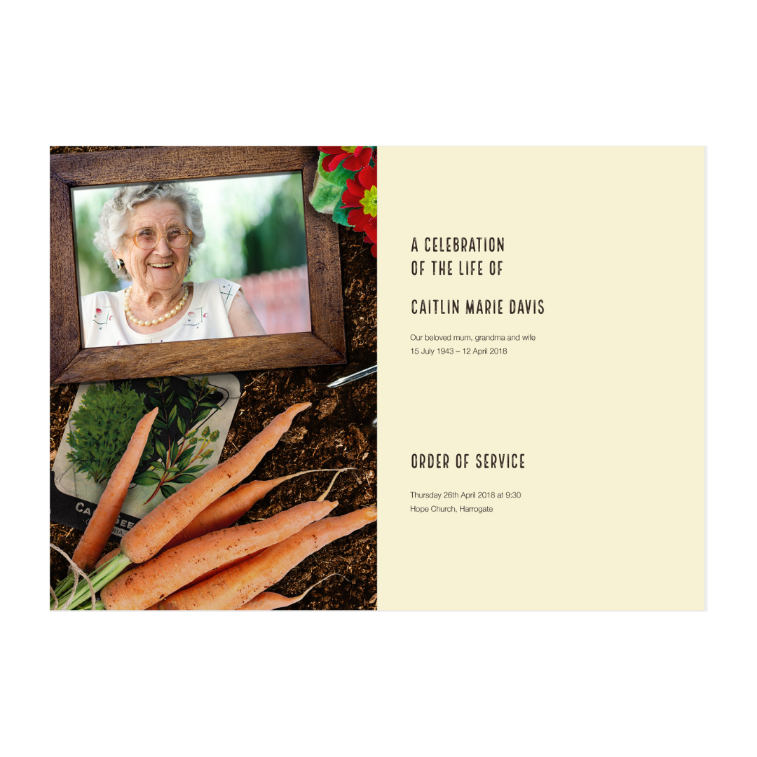 The Gardener Funeral Order of Service, themed around gardening, is an ideal celebration of life for a devoted gardening enthusiast and serves as a beautiful keepsake for family and friends. A contemporary alternative to traditional order of service formats, The Gardener offers a fitting memorial for a gardening lover. The outside and inside covers depict a garden scene, featuring tools, vegetables, and space for three personal photographs. The thick, uncoated cover and luxury weight text pages provide the top-quality finish it merits. Add a unique touch with your loved one’s name on marker sticks.