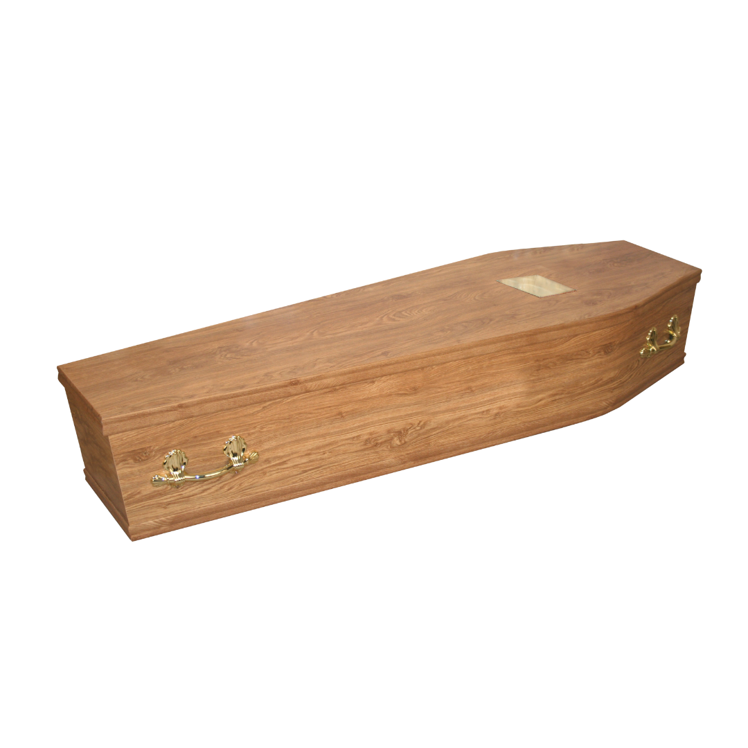 This simple yet high quality coffin is made with FSC certified chipboard and covered with light oak effect foil. The coffin is shown with four gold colour handles and a plaque. The very popular coffin is also certified by FFMA providing reassurance that it is suitable for both Burial and Cremation in the UK.