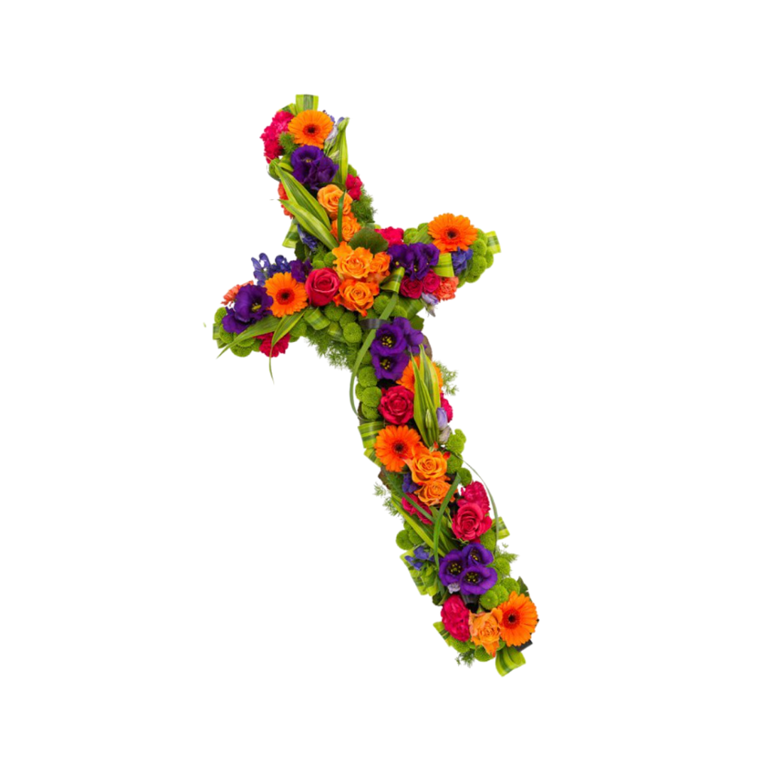 This viabrant cross is a classic alternative to the coffin spray. Carefully hand crafted using seasonal flowers in bright colours and lush green foliages, this is a fitting tribute for a traditional Christian Funeral.