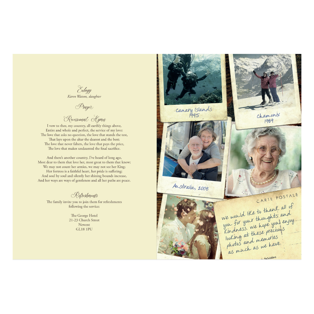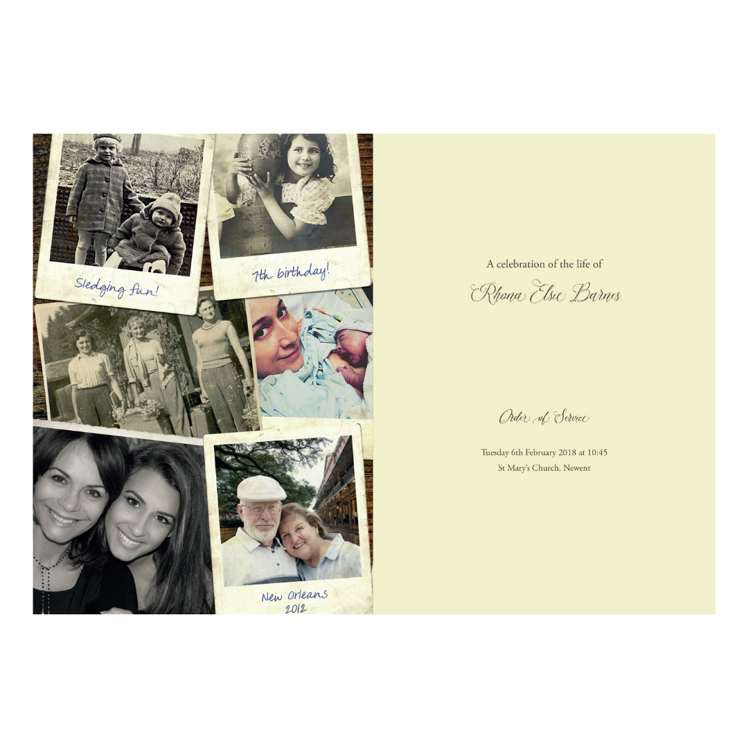 This vintage-style Order of Service booklet not only commemorates the life of your loved one but also serves as a beautiful keepsake for family and friends to treasure. A contemporary departure from traditional funeral stationery, this vintage-style order of service allows for the inclusion of 22 favourite photographs on the outside and inside covers, reminiscent of vintage polaroids, with the option to add captions. Featuring a thick, uncoated cover and luxury weight text pages, it boasts the top-quality finish it rightfully deserves.
