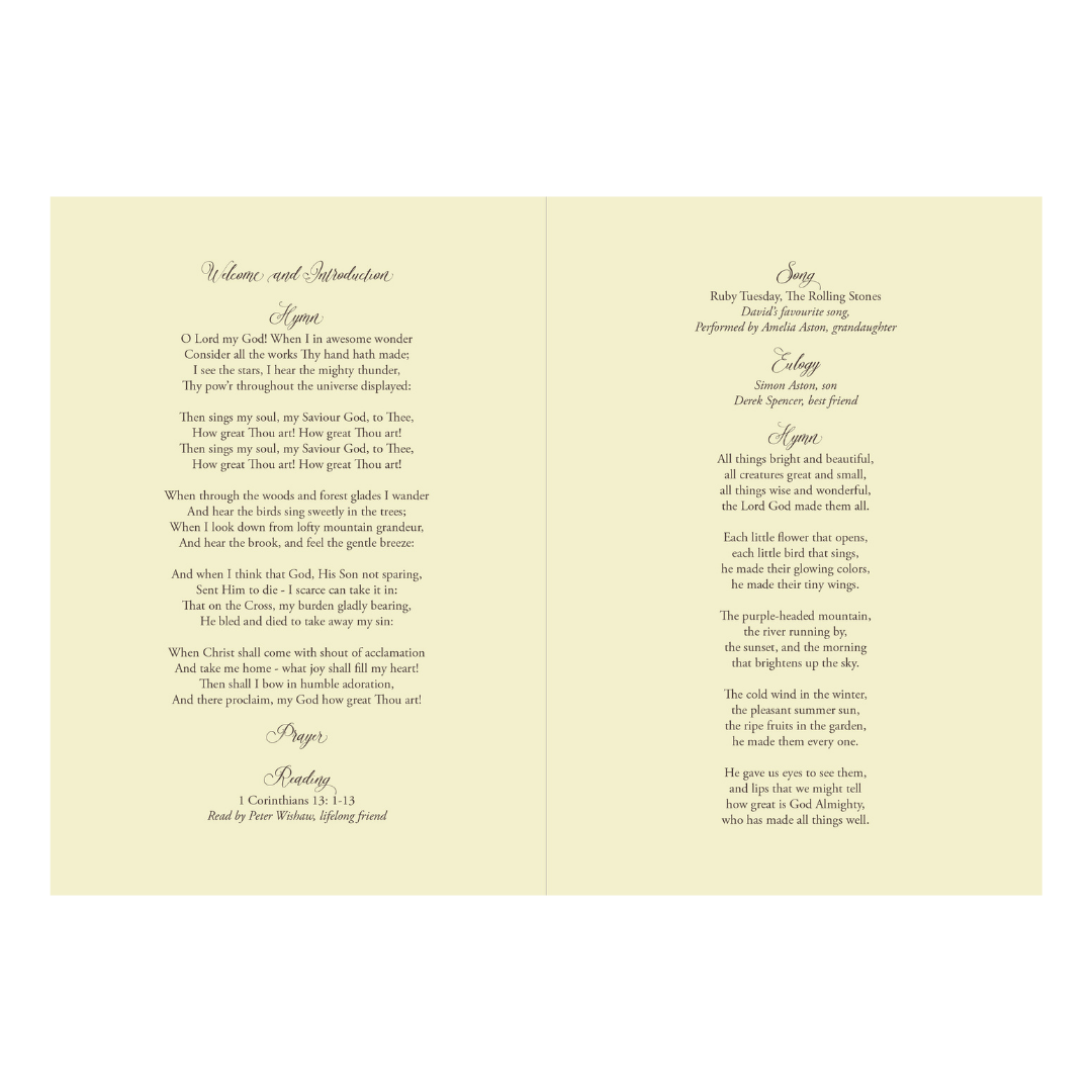 Include readings, hymns, and details about your loved one in our funeral order of service booklets, designed to be as unique as the special person you’re remembering. The photographs offer family and friends a chance to view unseen moments, rekindling memories and stories to share. We recommend selecting a diverse range of photos, portraying your loved one at different ages, enjoying various aspects of life, and sharing experiences with those close to them.