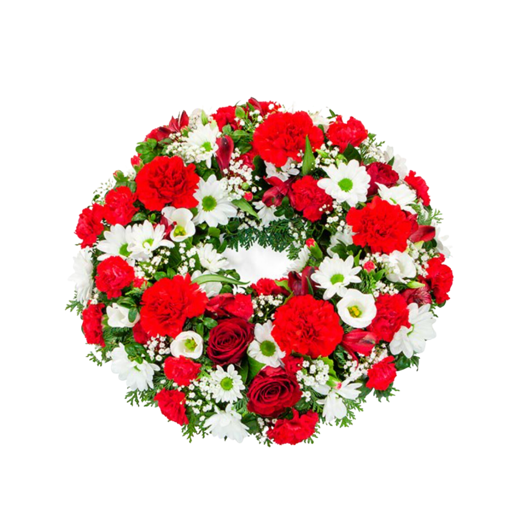 This viabrant floral wreath is handcrafted by our talented atrisans using a variety of seasonal white and red flowers based on the season and availability of the flowers. This beautiful and elegant wreath is a fitting tribute for any funeral services and can be delivered across UK.